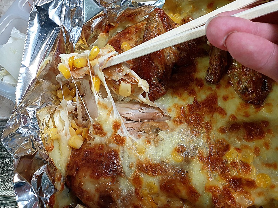 콘치즈 안에는 통닭의 뽀얀 속살이 있어요.